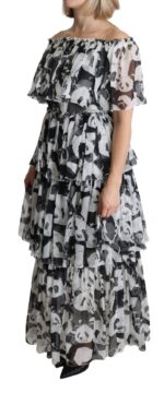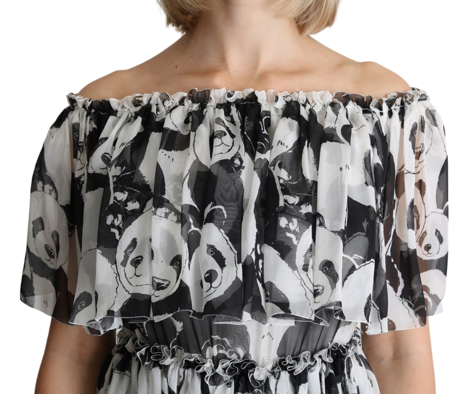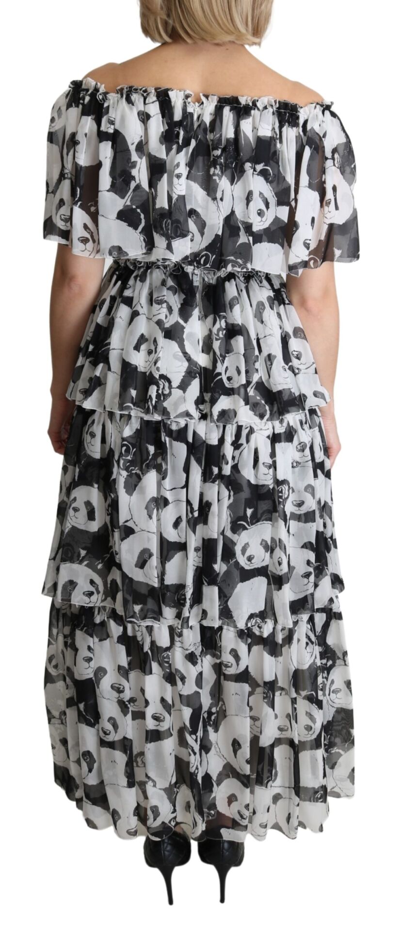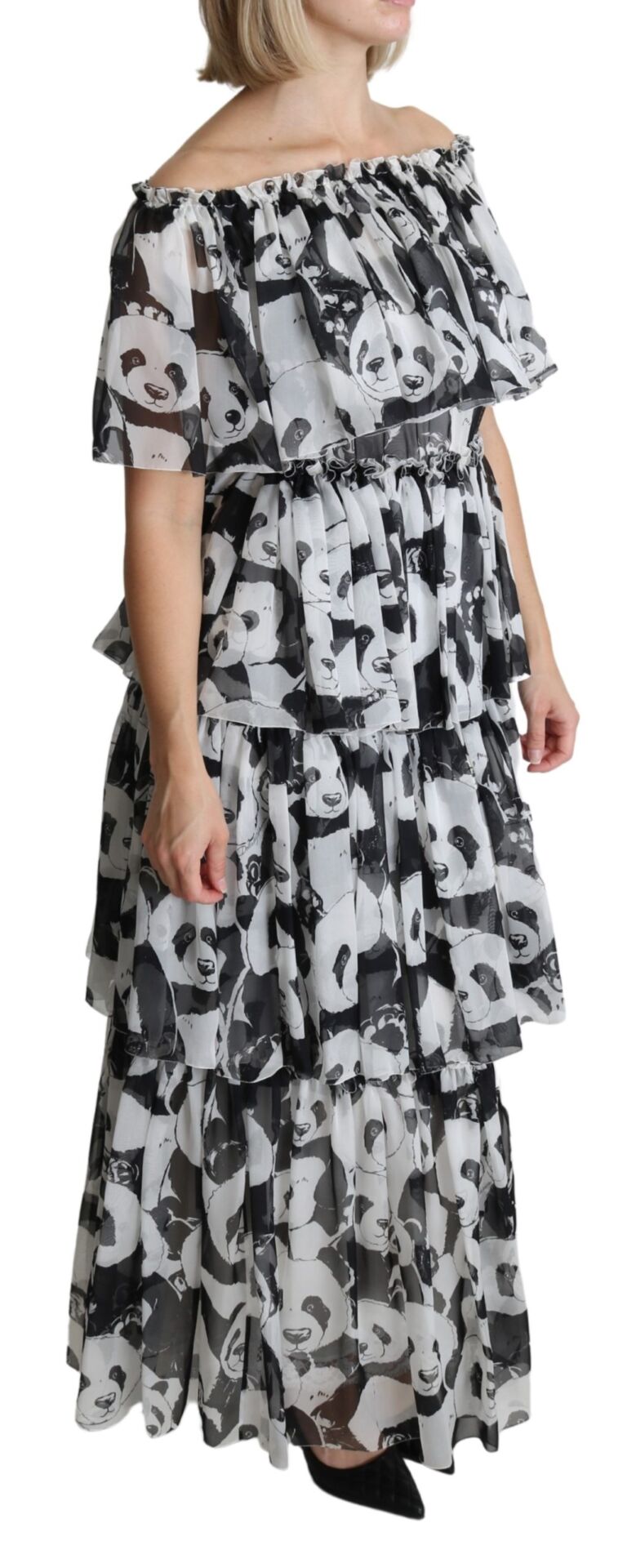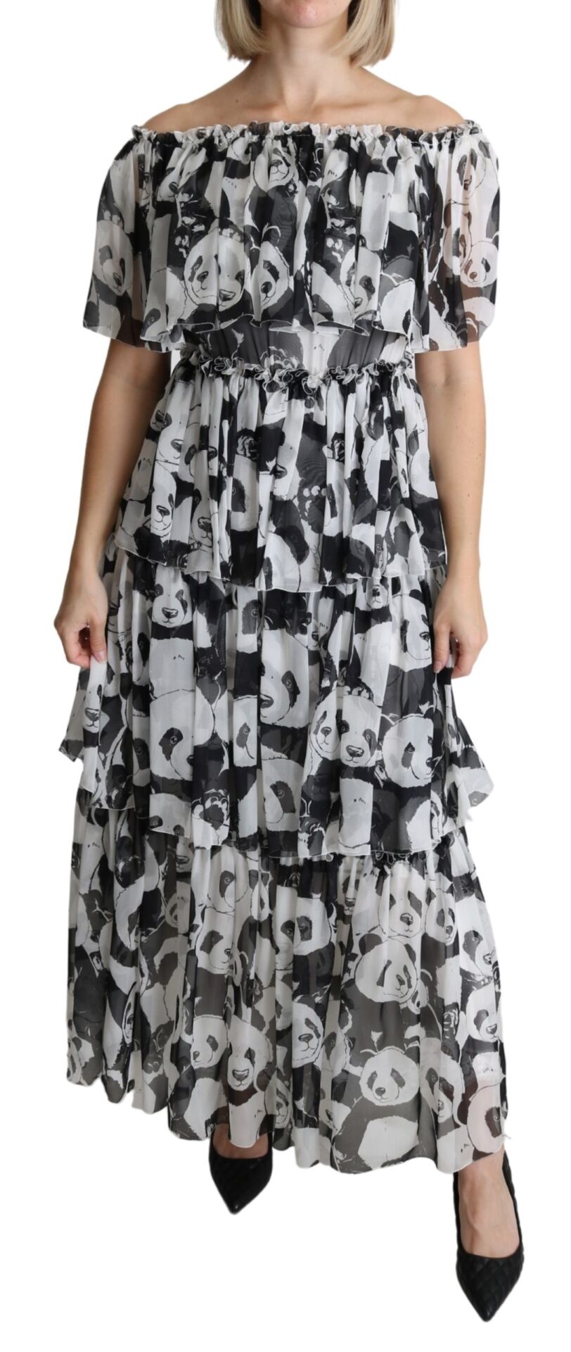 Gorgeous brand new with tags, 100% Authentic Dolce & Gabbana Dress with panda print is made of pure silk. This dress features off shoulder, shorts sleeves, layered and floor length cut.