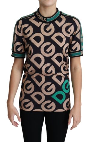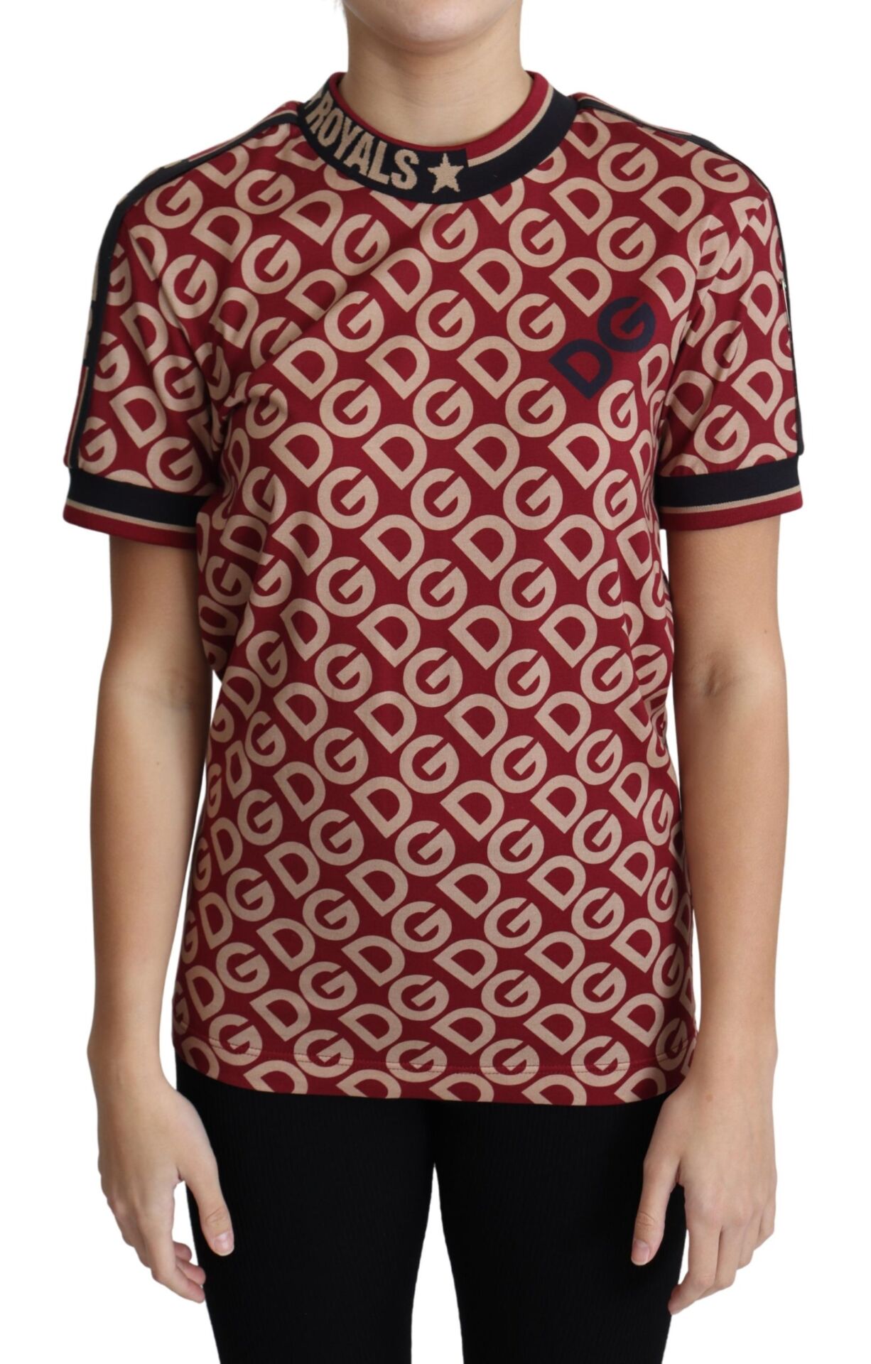 Gorgeous brand new with tags, 100% Authentic Dolce & Gabbana Tops. The straight-cut model is made of soft jersey with a repeating DG abbreviation. Burgundy, beige and black colors were played in the range of the motive. The crew neckline and sleeves are marked with a striped pattern and the lettering “Queen” and “Royals”.
