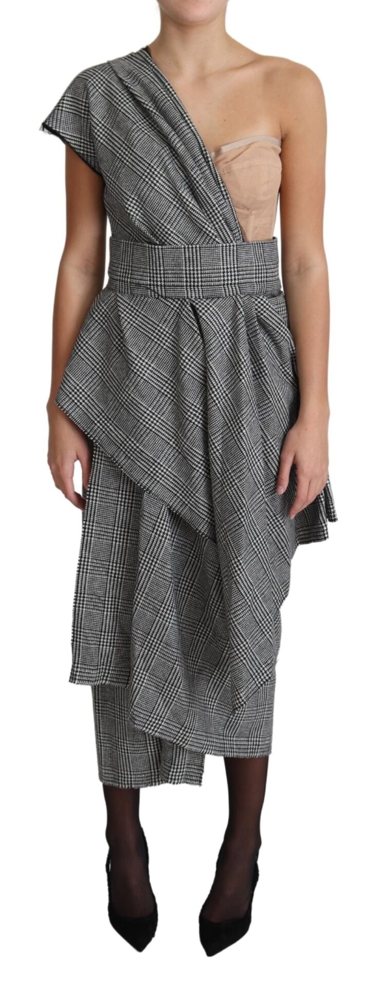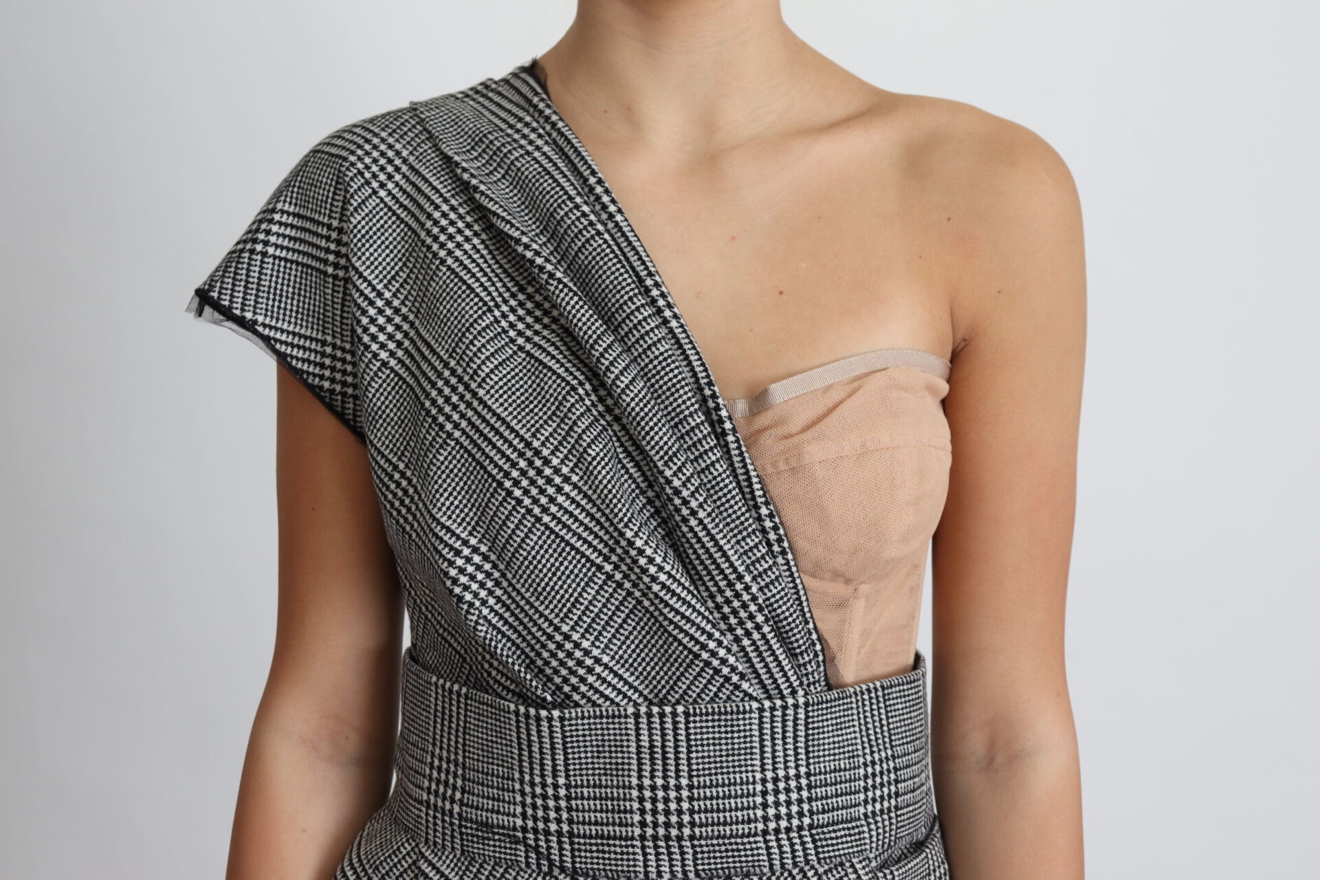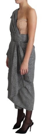 Gorgeous brand new with tags, 100% Authentic Dolce & Gabbana one-shoulder Prince of Wales dress with nude tulle bustier top. It features a tonal waist belt, draped skirt, overlapping panels, back zip, hook and button closure.