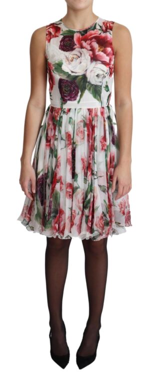 White Peony Rose Print Chiffon Silk Dress