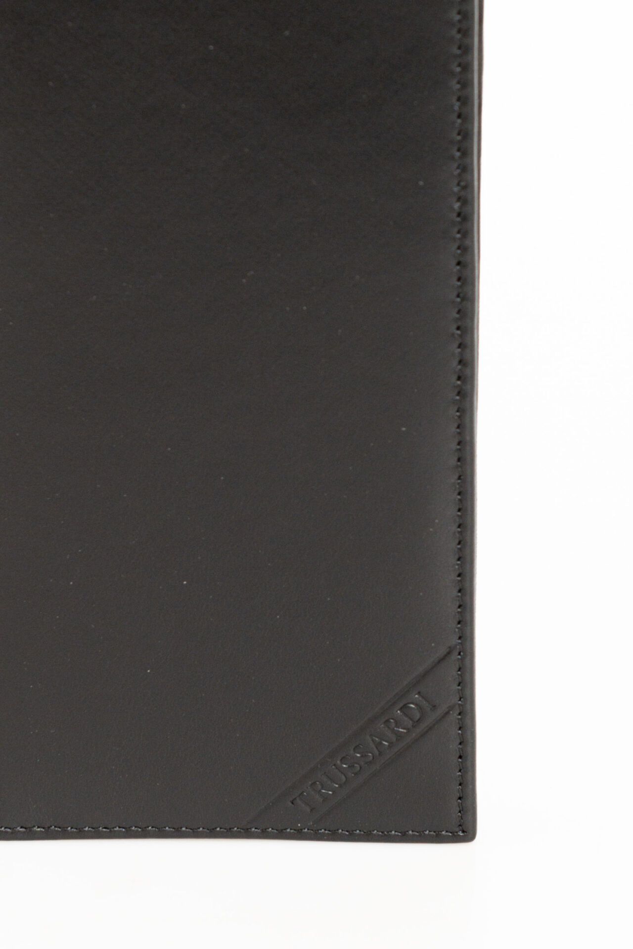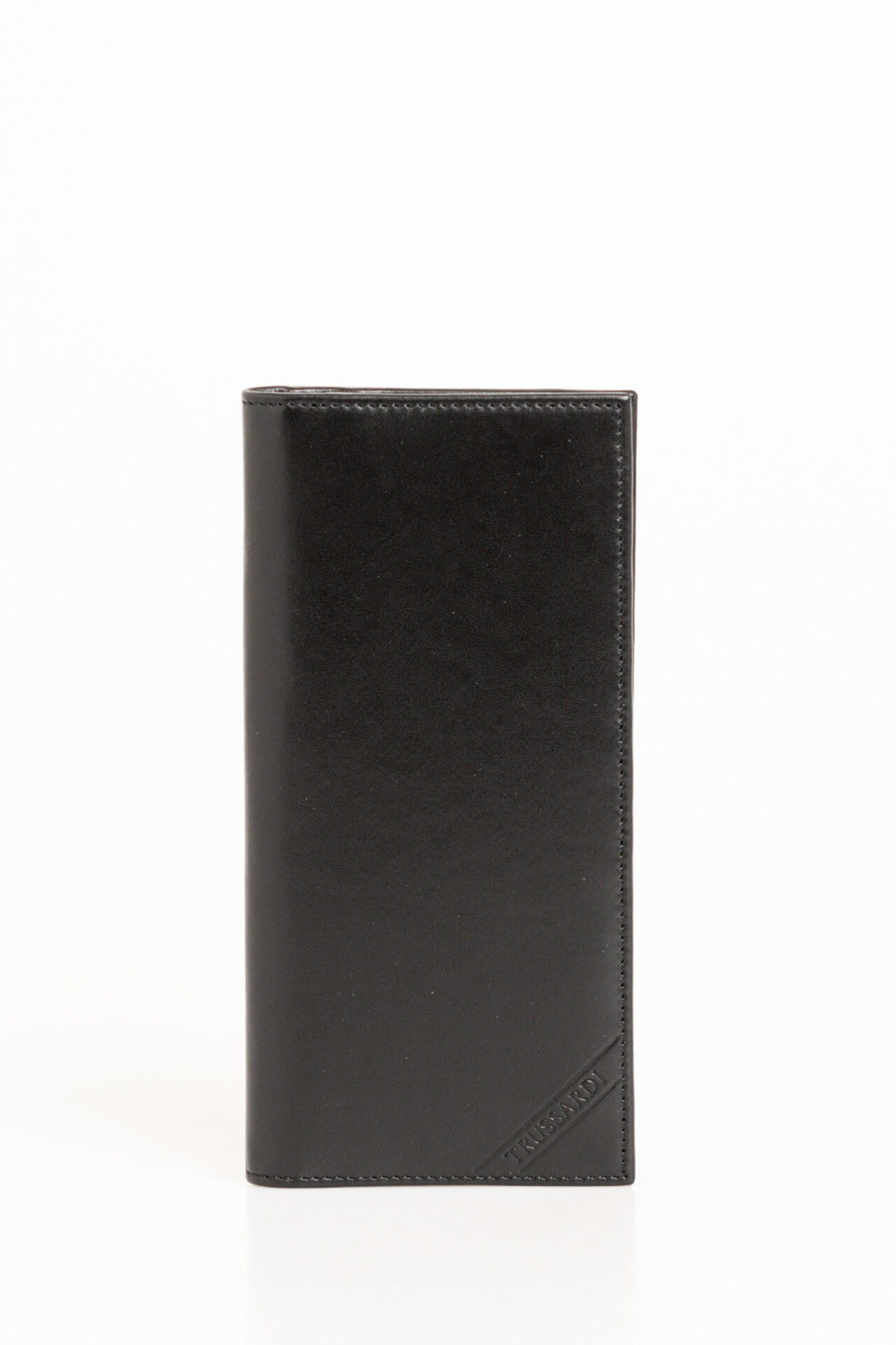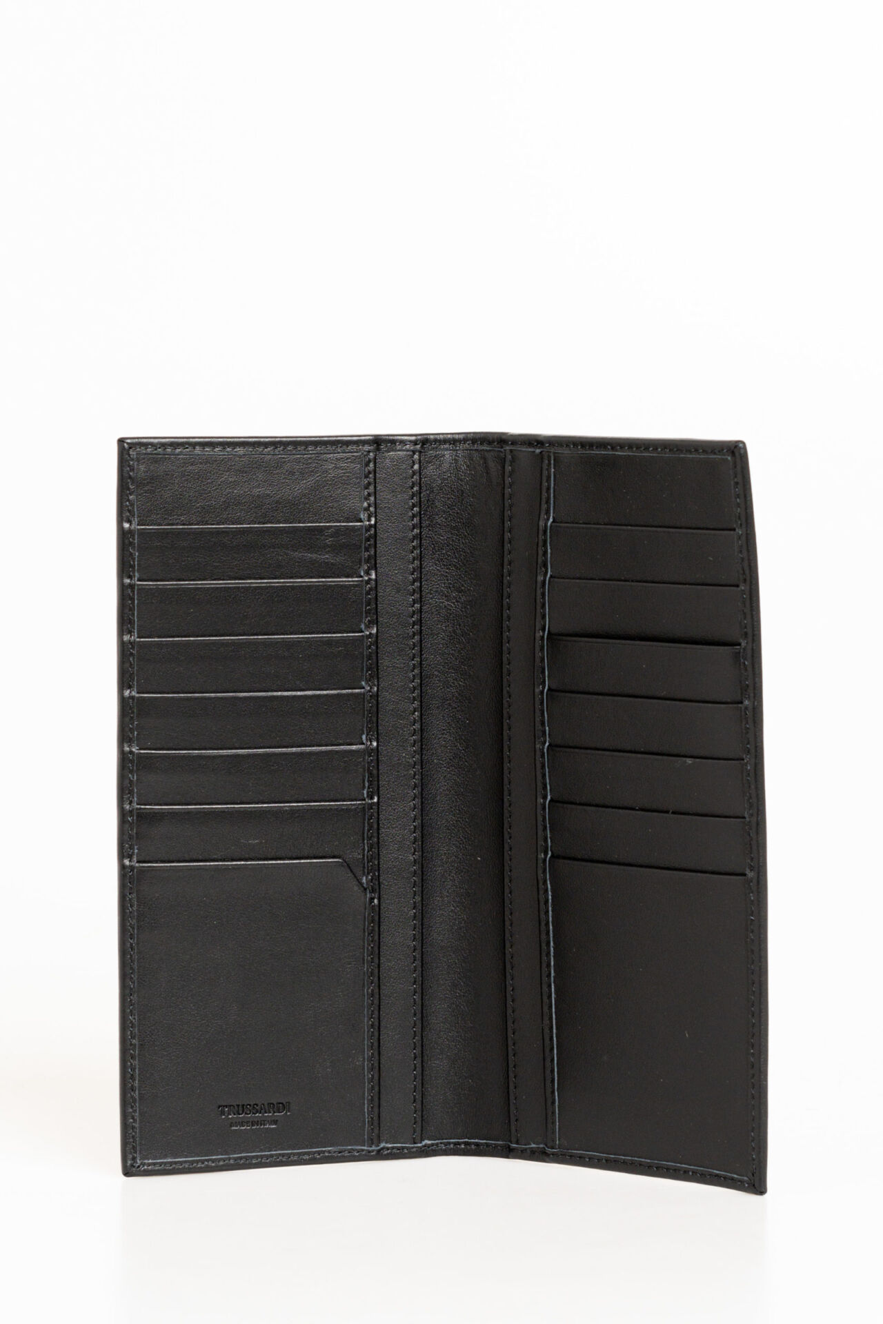 Vertical Opening Wallet In Solid Fine-grained Crepe Leather. Matching Stitching Surround The Model. Trussardi Lettering Logo Embossed In A Band In The Lower Corner. Dimensions: 20 X 10 X 2
