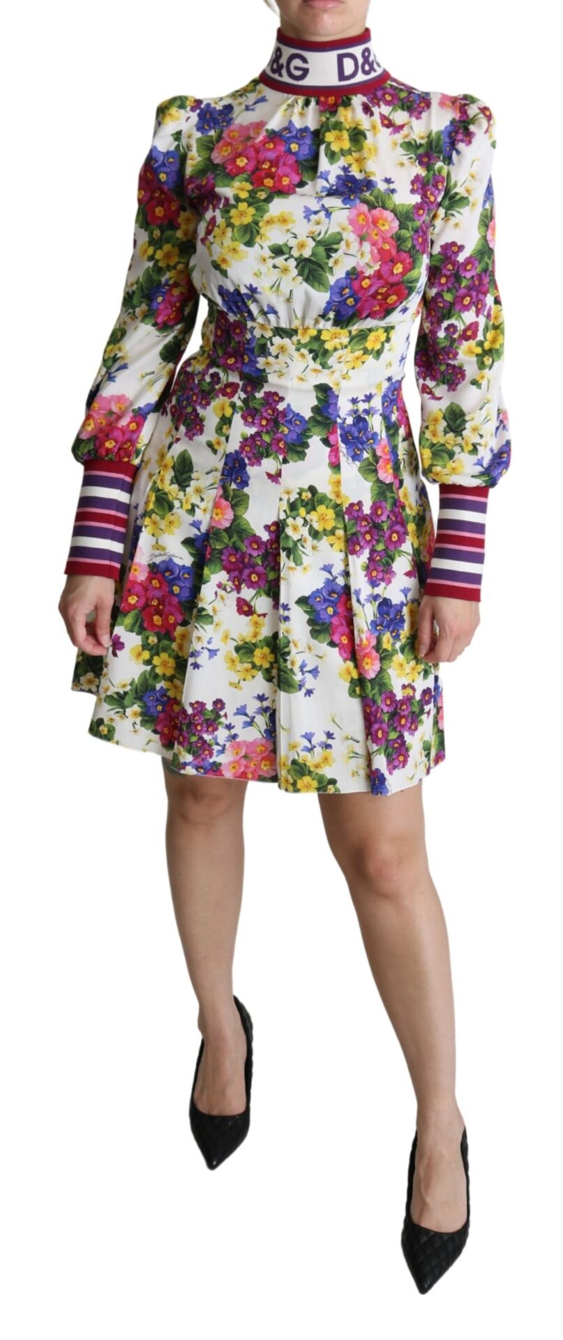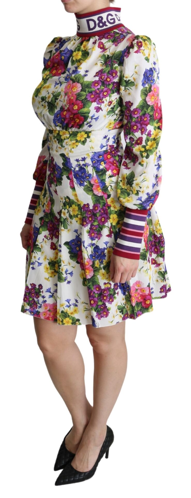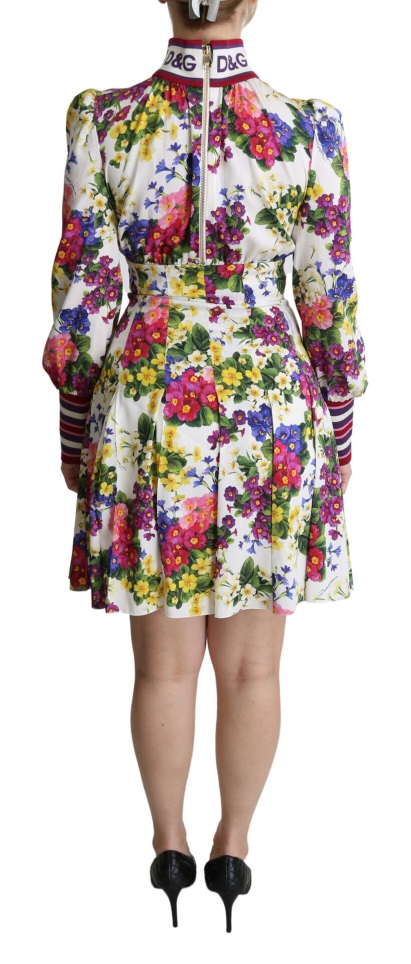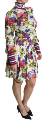 Multicolor Floral Pleated Mini Silk Logo Dress
