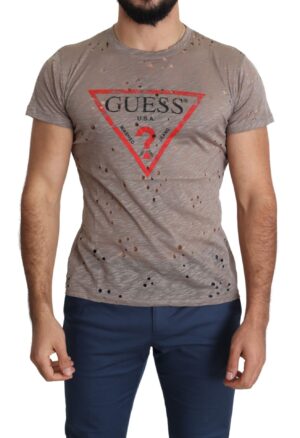 Brown Cotton Stretch Logo Print Men Casual Perforated T-shirt