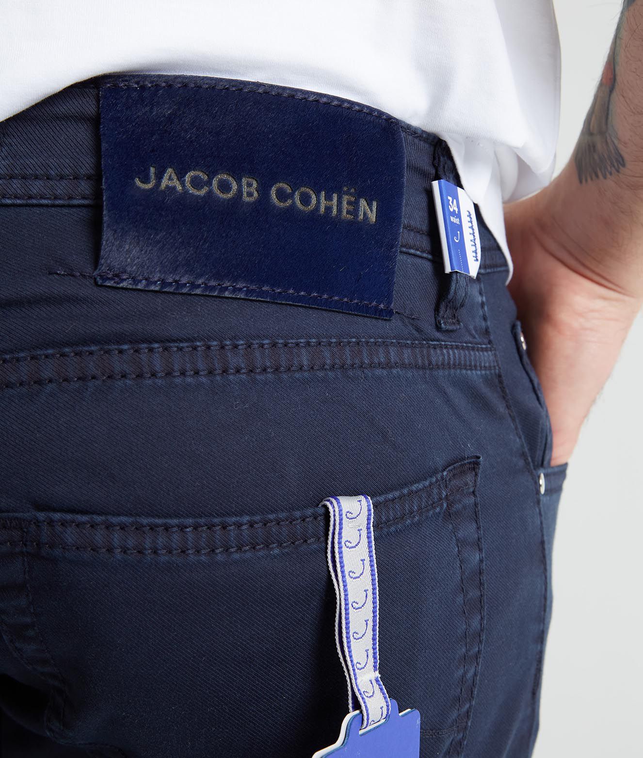 Navy blue stretch-cotton low-rise slim-fit trousers from JACOB COHEN featuring leather tag, low-rise, belt loops, front button and zip fastening, classic five pockets, slim cut and ankle-length.