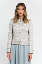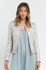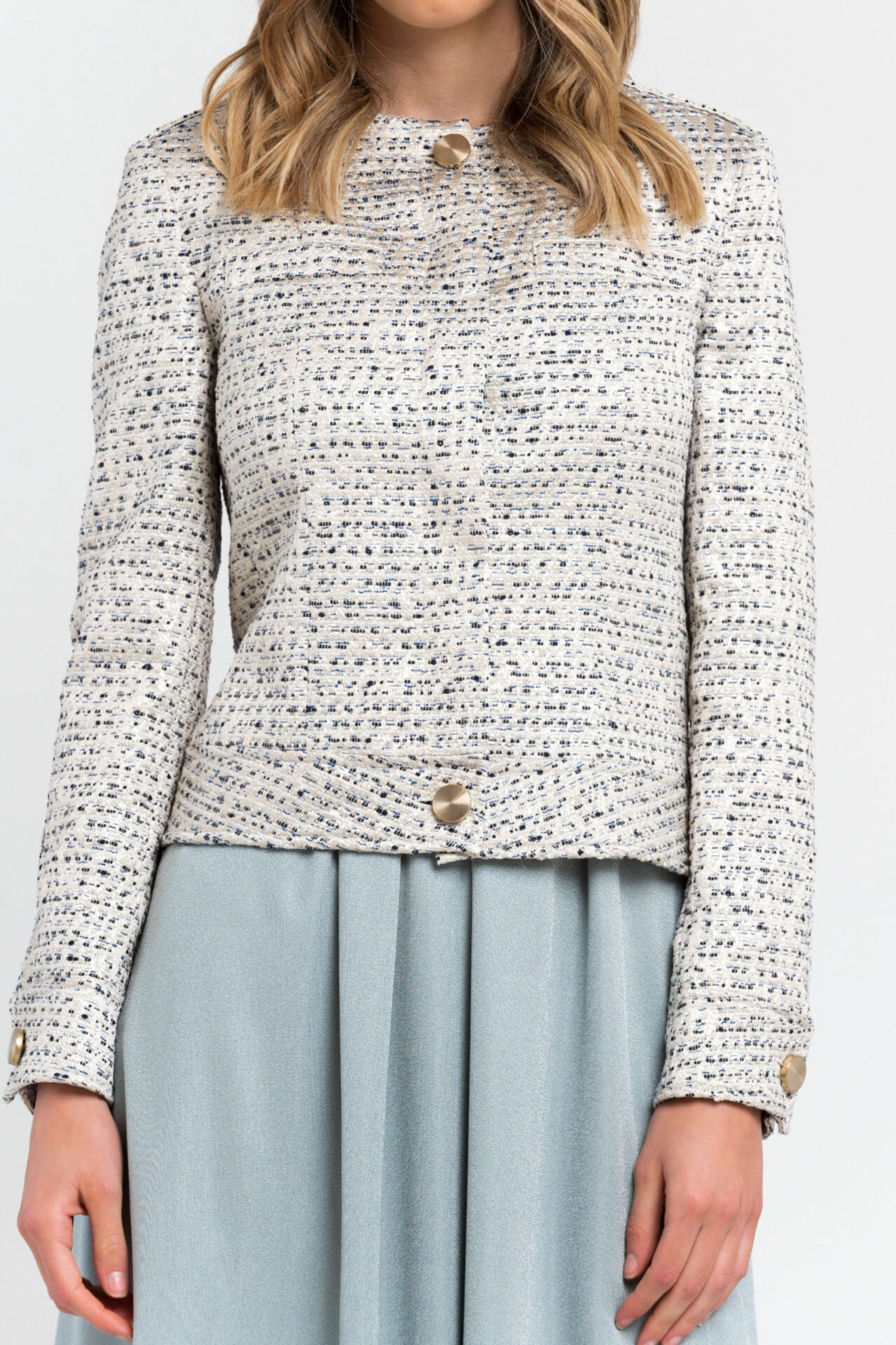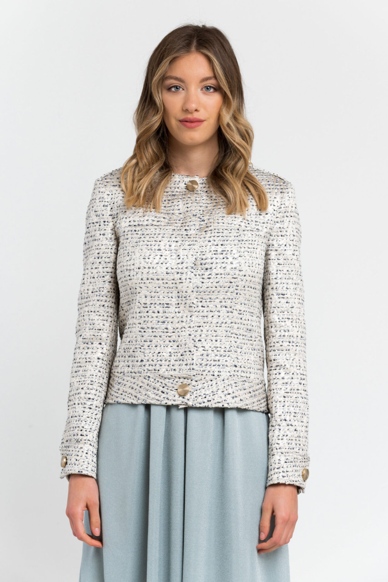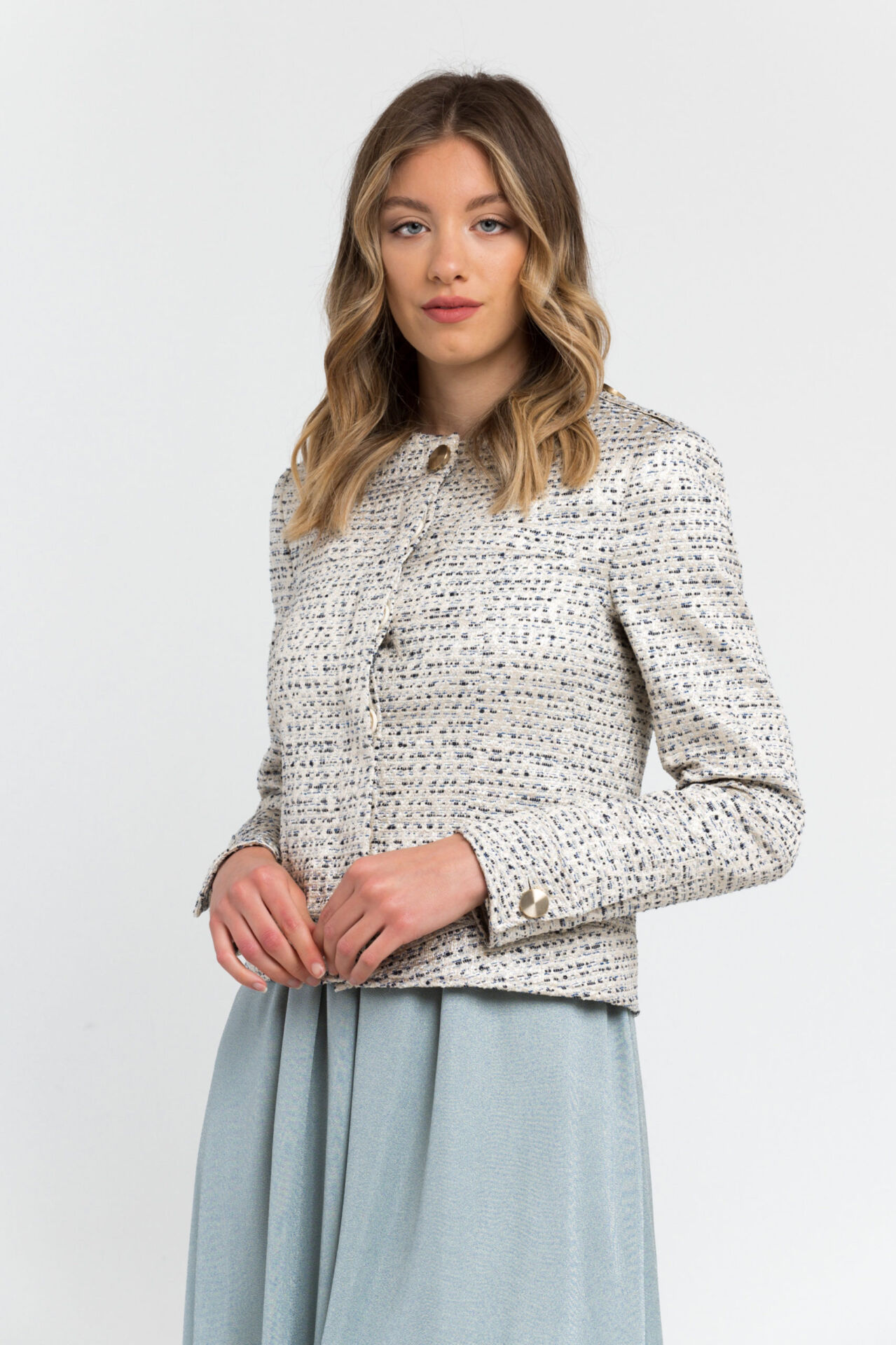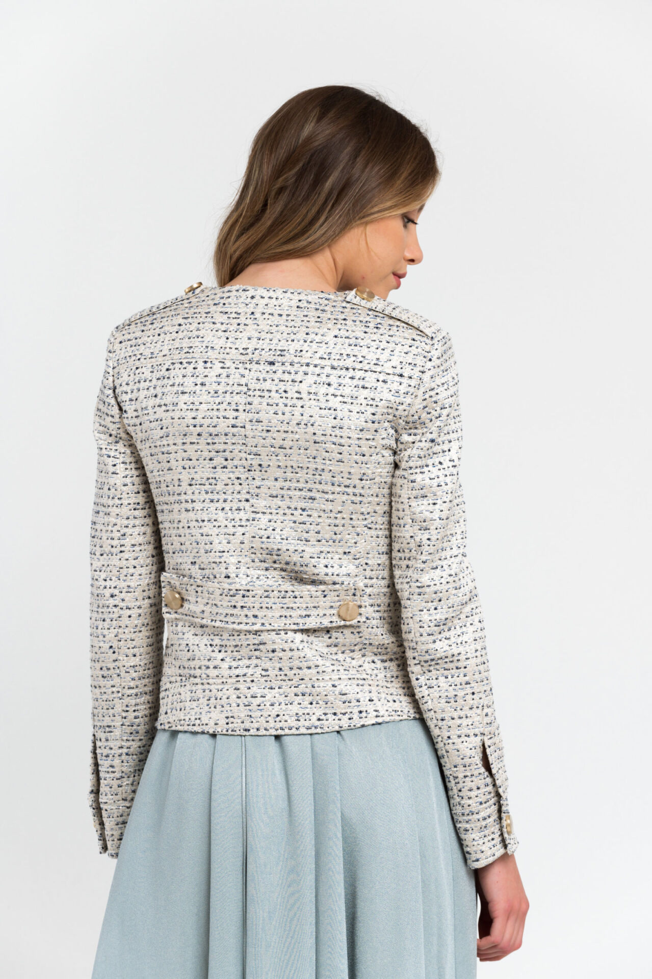 Cotton Blend Blazer Features Jacquard Detailing Creating A Striped. Dotted Pattern Effect. The Shoulder Epaulettes. Half-belt At The Back And Cuffs With Shiny Classic Buttons.