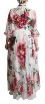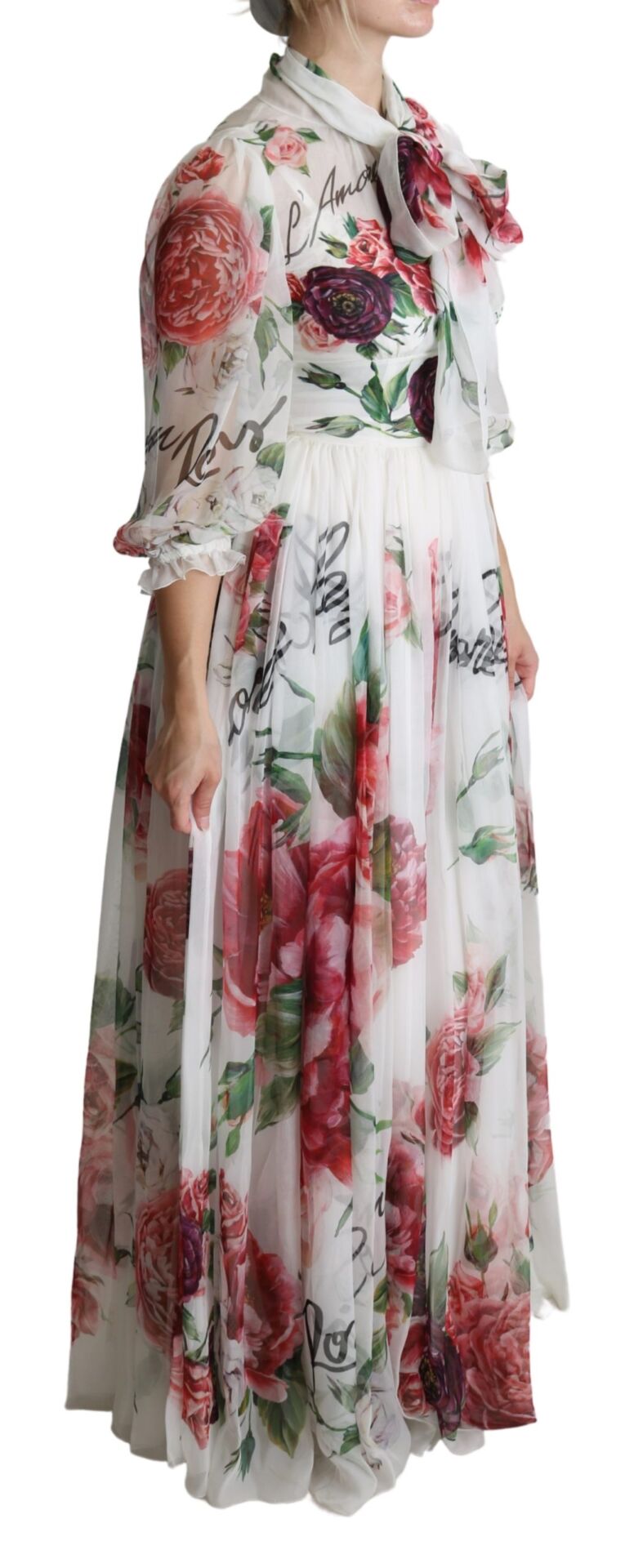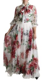 Gorgeous brand new with tags, 100% Authentic Dolce & Gabbana Dress is a beautiful white lined long dress with red, purple and green colored pattern. Featuring elastic sleeve mouth, neckline with ribbon, zip and hook closure.